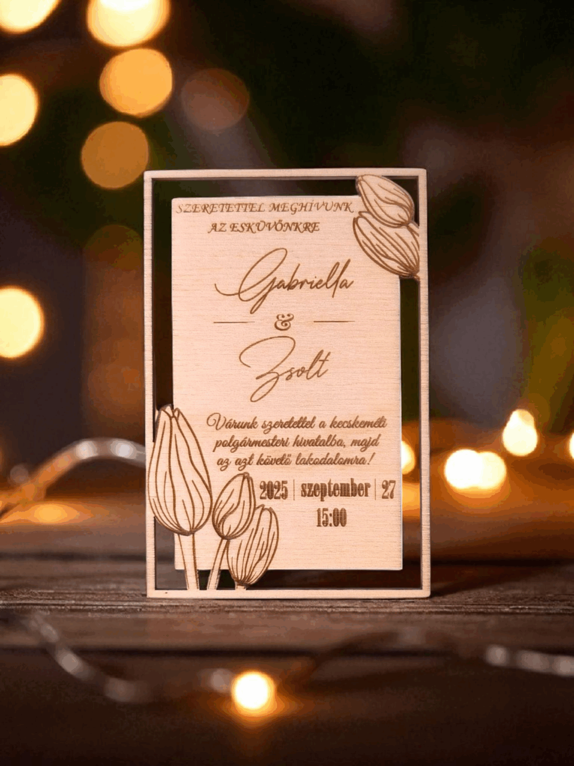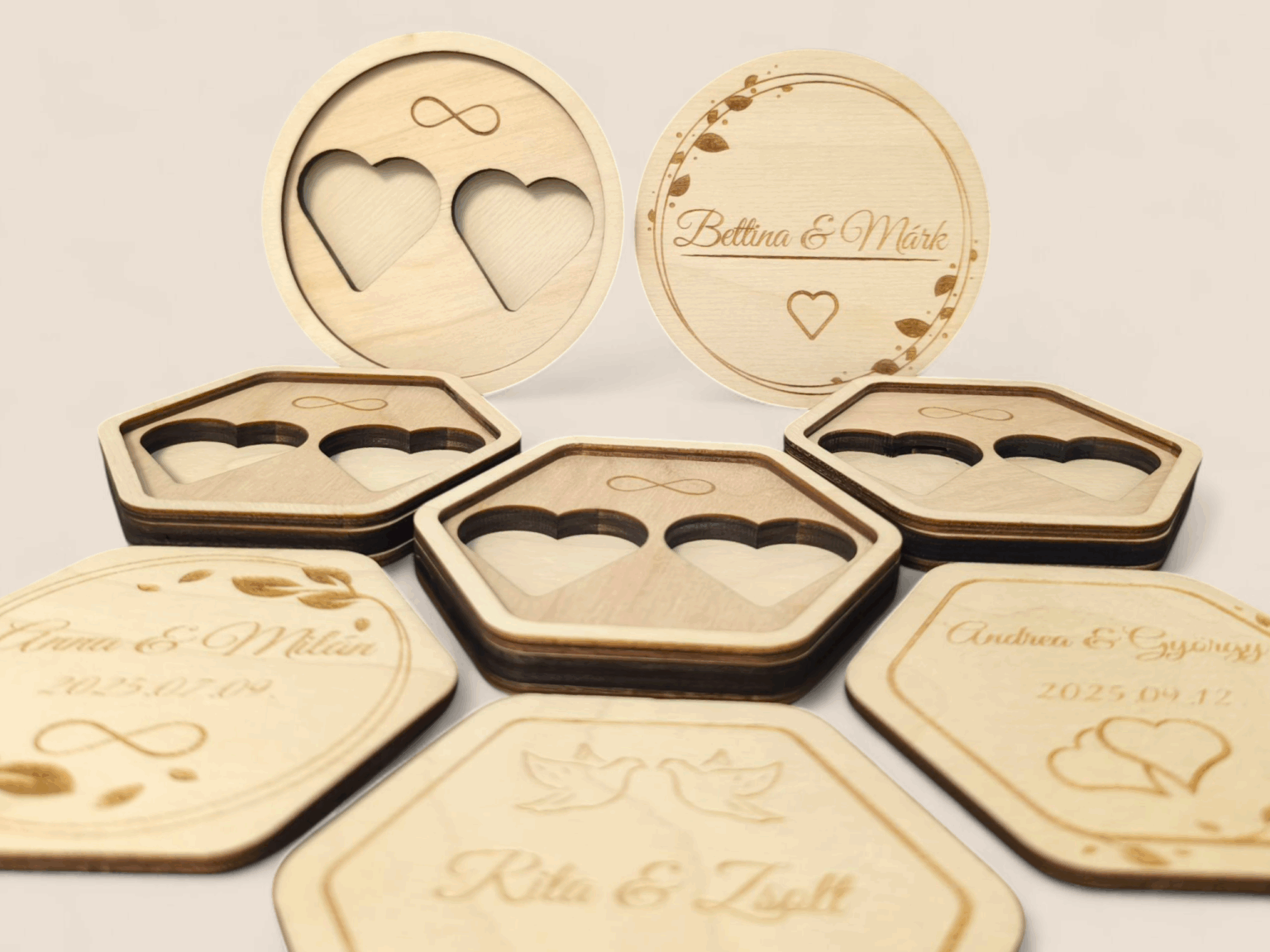 Tegye igazán különlegessé a nagy napot egyedi lézervágott, gravírozott esküvői termékekkelMinden termékünk kézzel készült, hogy tükrözze a pár személyes történetét és stílusát. Legyen szó üdvözlő táblával, pénzátadó dobozzal, személyre szabott feliratról vagy vendégkönyvről, termékeink mindegyike a legmagasabb minőséget és a legapróbb részletekig való precizitást biztosítja. A legdivatosabb faanyag és a legjobb lézervágó technológia biztosítja, hogy minden termék tartós és esztétikus legyen.