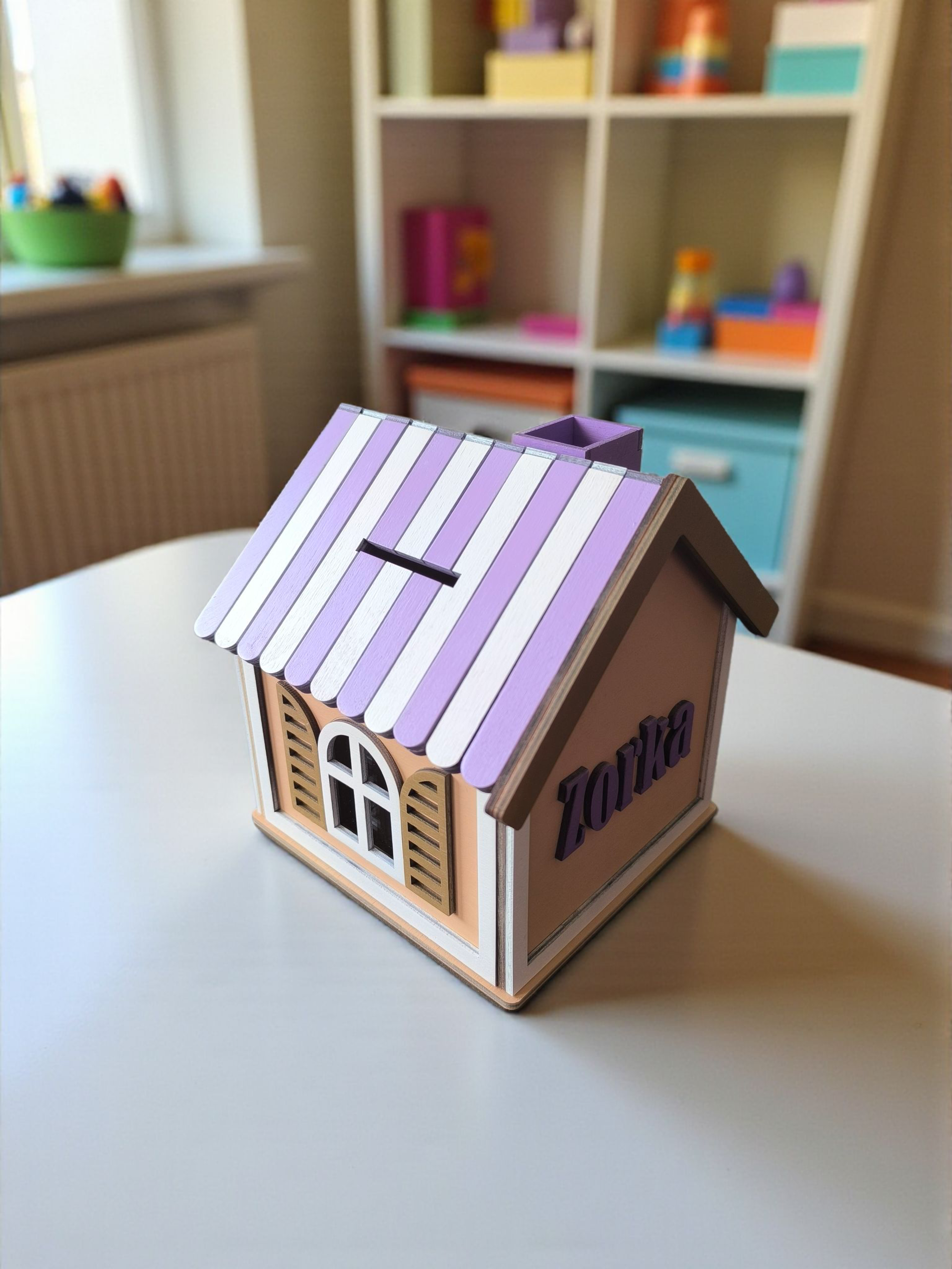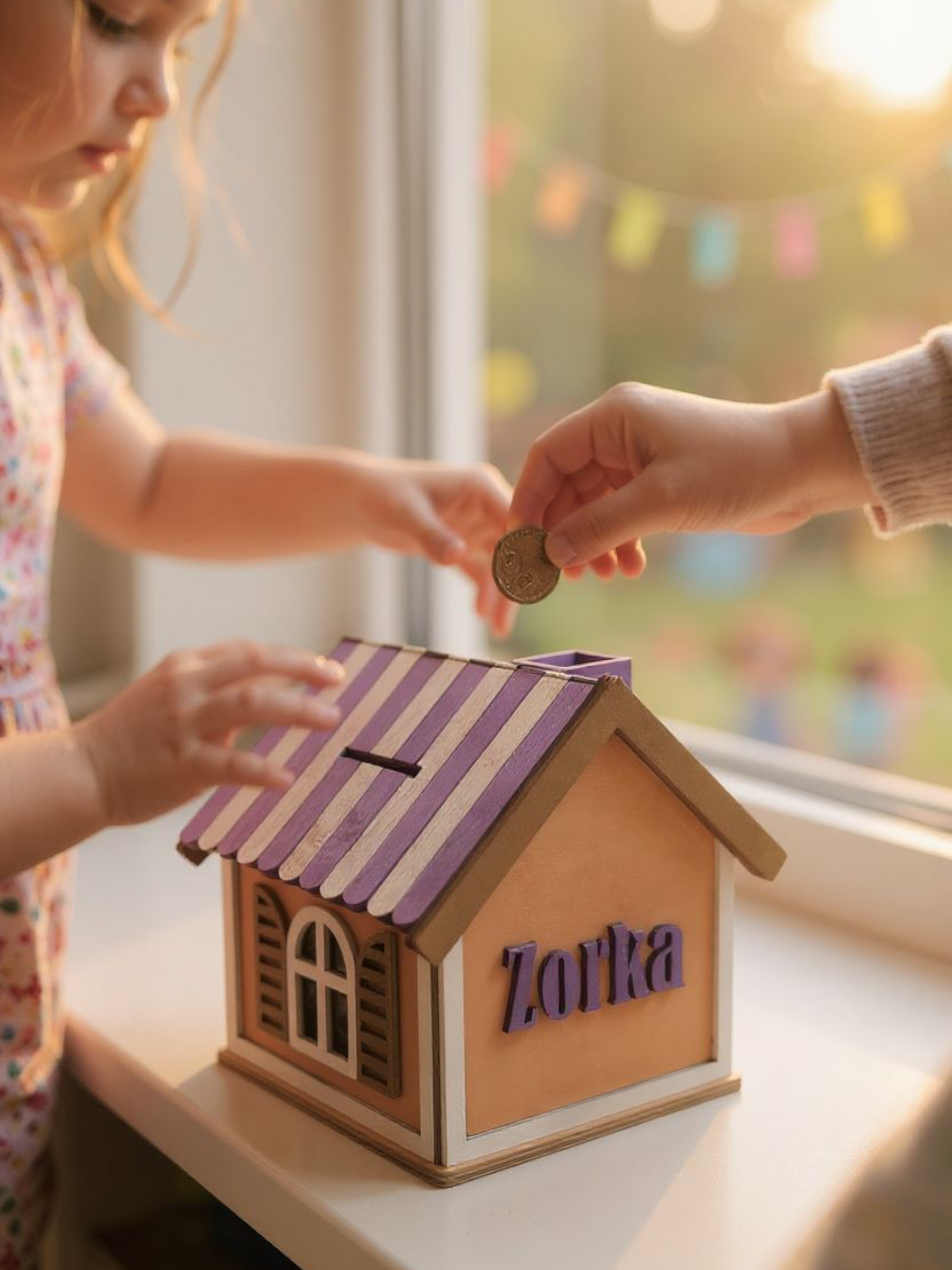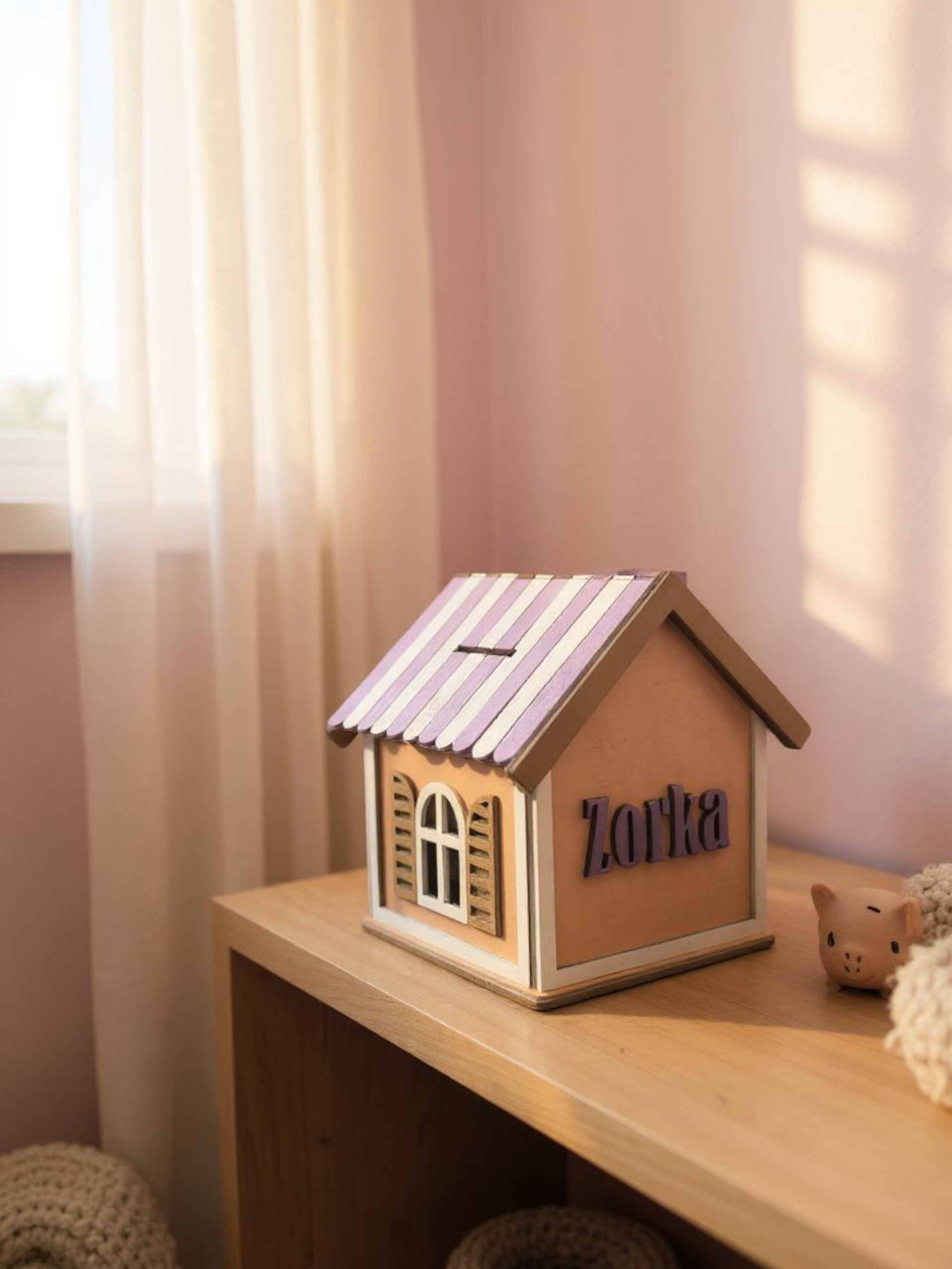 Bájos, névre szóló házikó persely, ahol a kis álmodozók örömmel gyűjtik saját kincseiket!