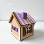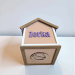 Persely – Egyedi, házikó formájú fa persely névvel és színes, festett részletekkel