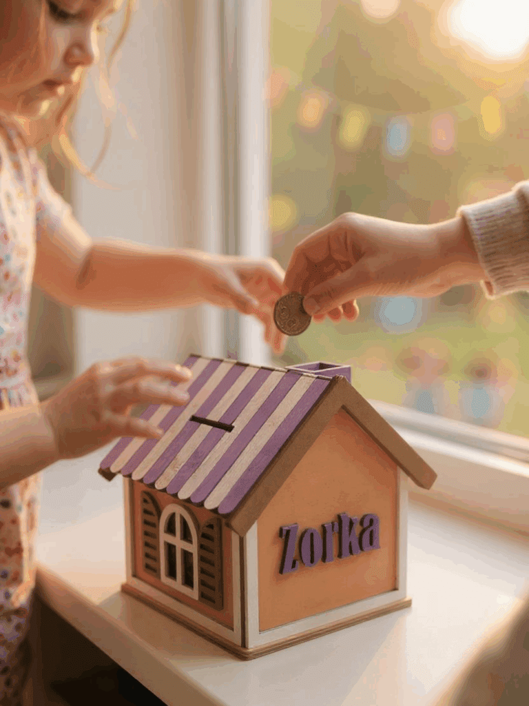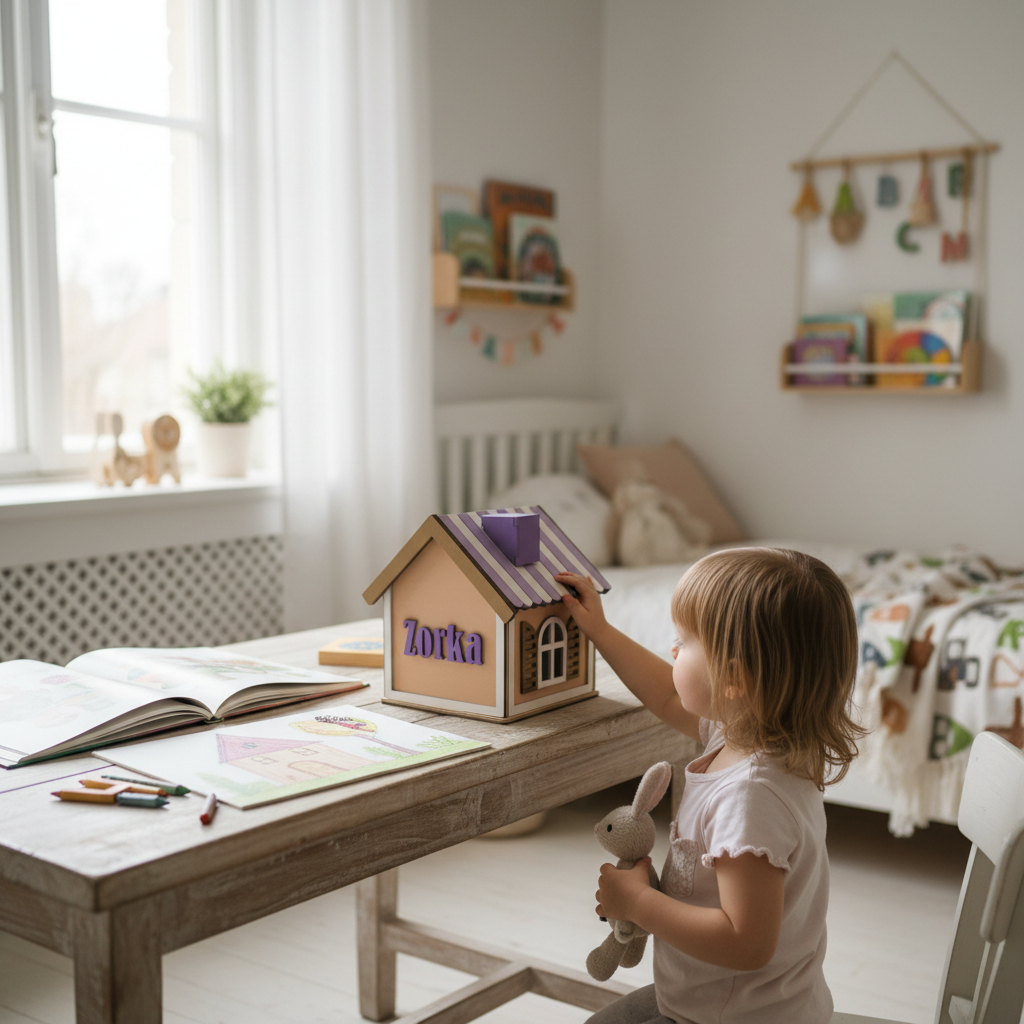 Bájos, névre szóló házikó persely, ahol a kis álmodozók örömmel gyűjtik saját kincseiket!