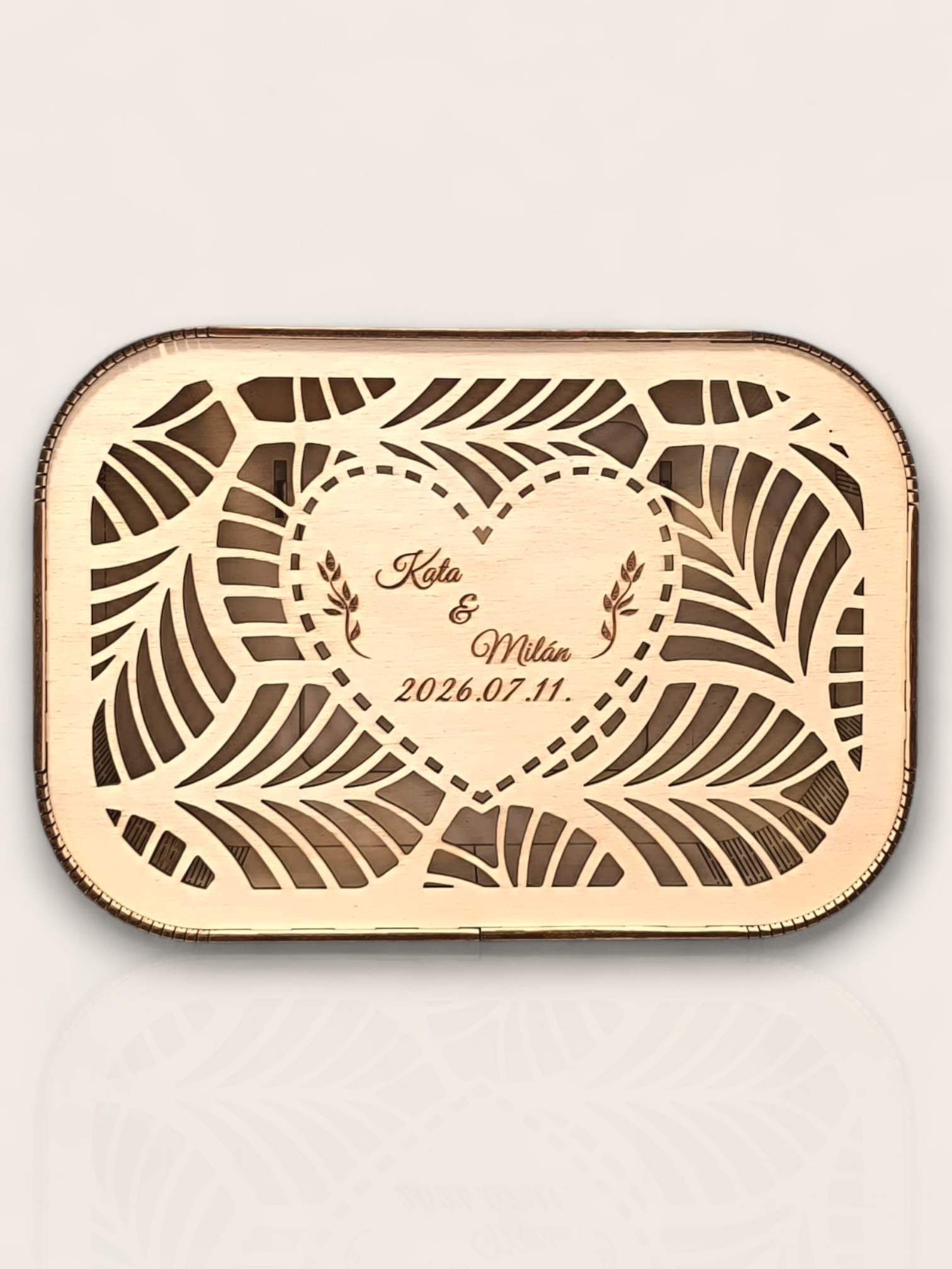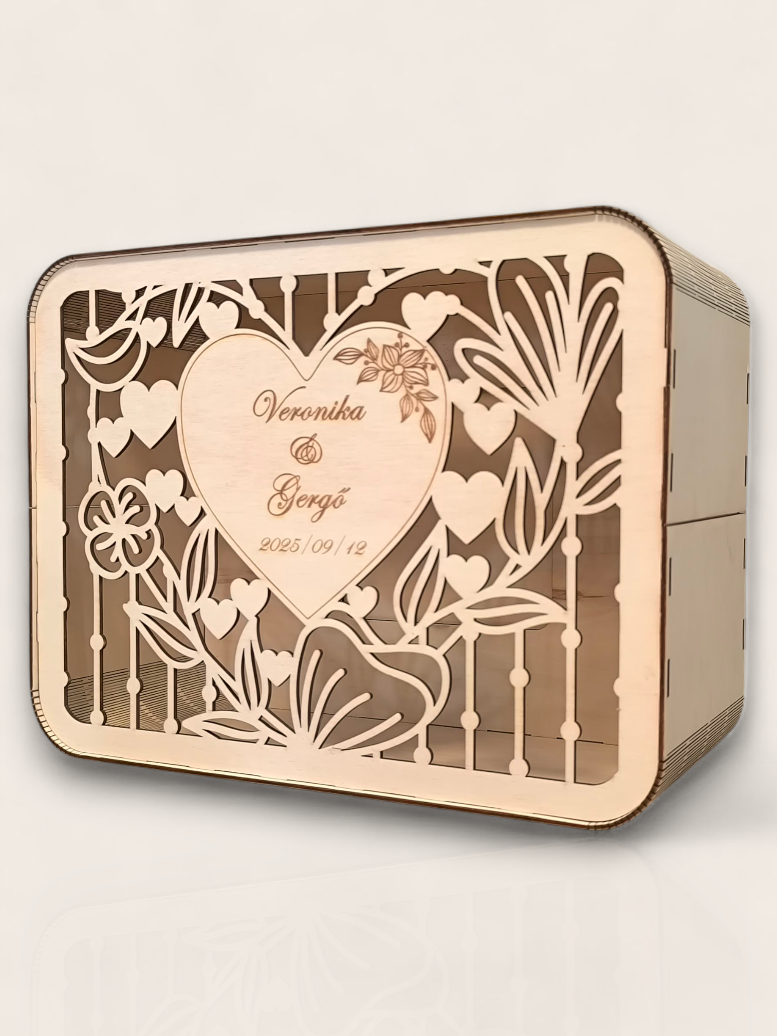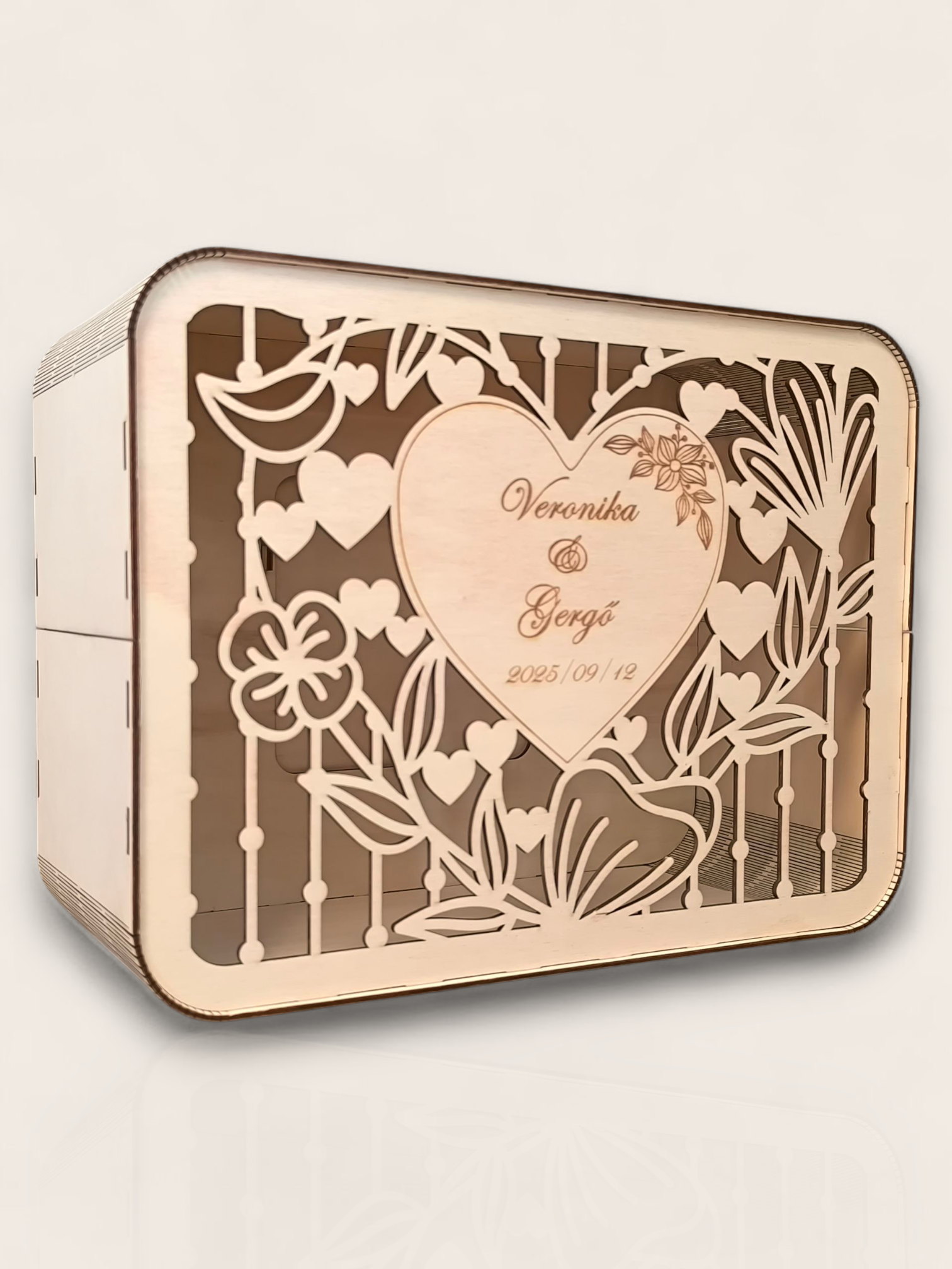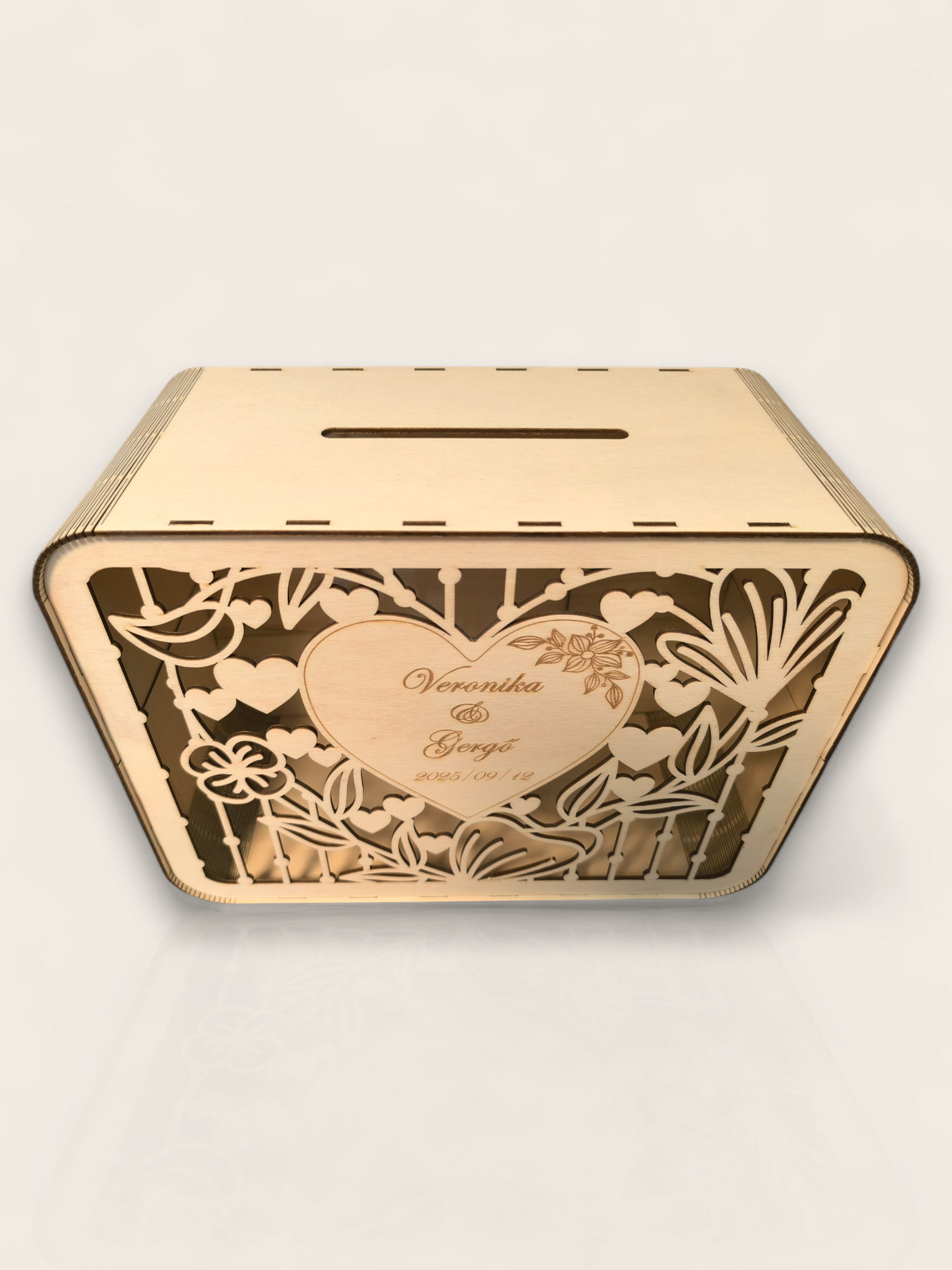Ez a nagyméretű, gravírozott pénzgyűjtő doboz tökéletes az esküvői ajándékasztalra. A vendégek egyszerűen bedobhatják a pénzt, utalványt vagy kártyát tartalmazó borítékokat – diszkréten és rendezetten. A doboz 3 mm vastag nyír rétegelt lemezből készül, a tetején lévő nyíláson keresztül dobhatók be a borítékok. Az elején lézergravírozással szerepel a házaspár neve és az esküvő dátuma – kérésre akár egyedi szöveggel, idézettel is. Hátul nyitható.