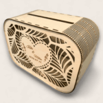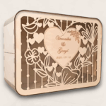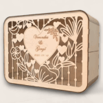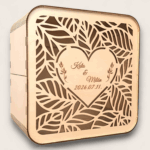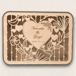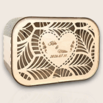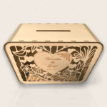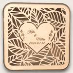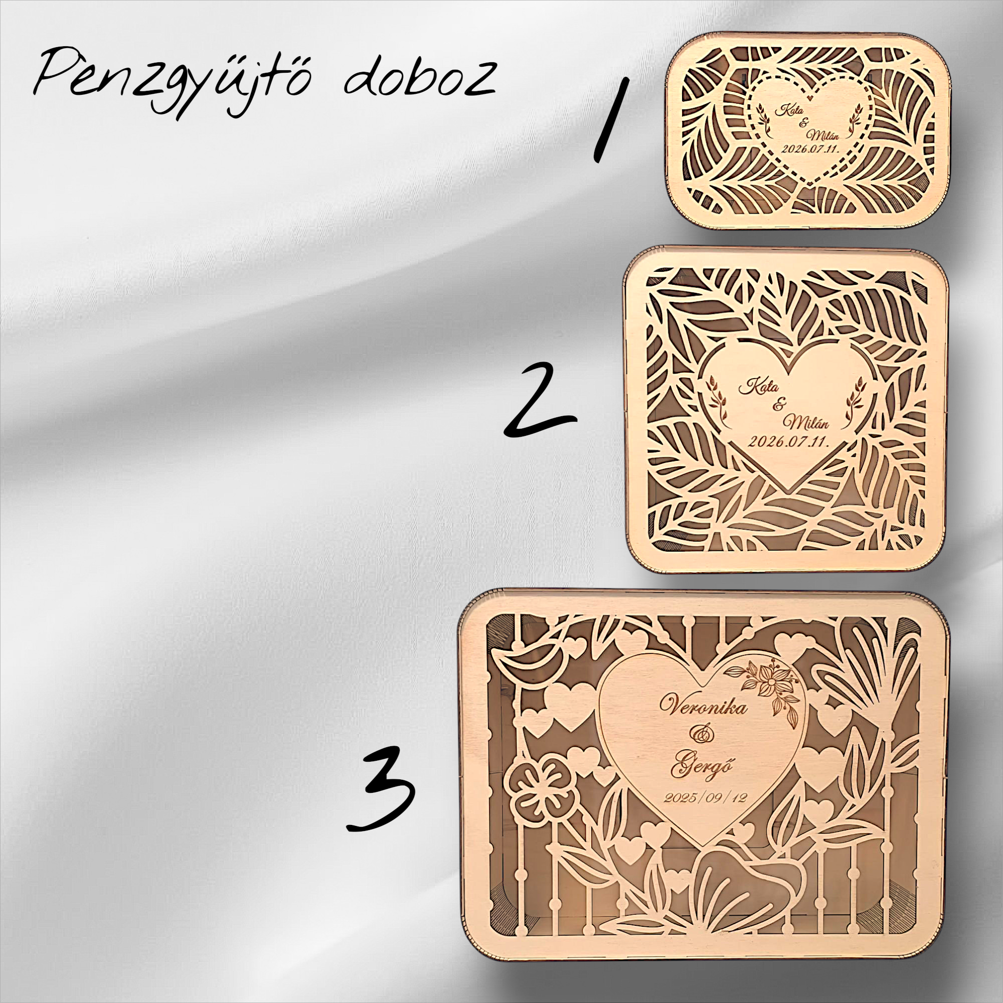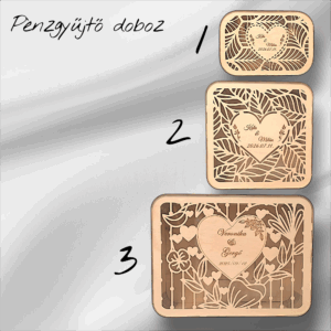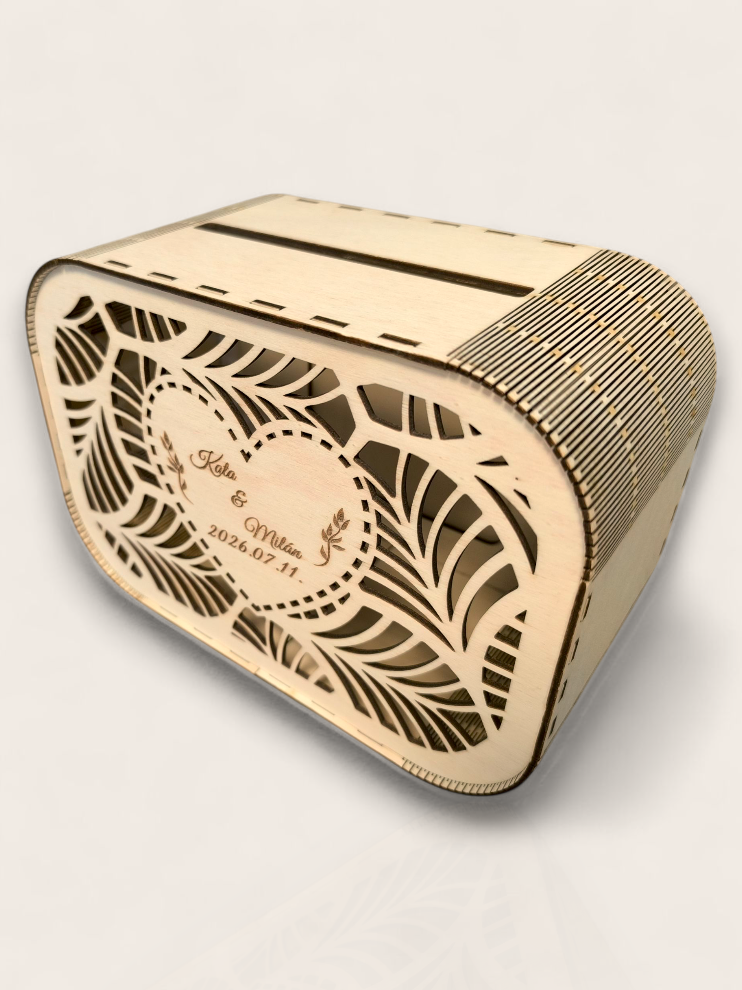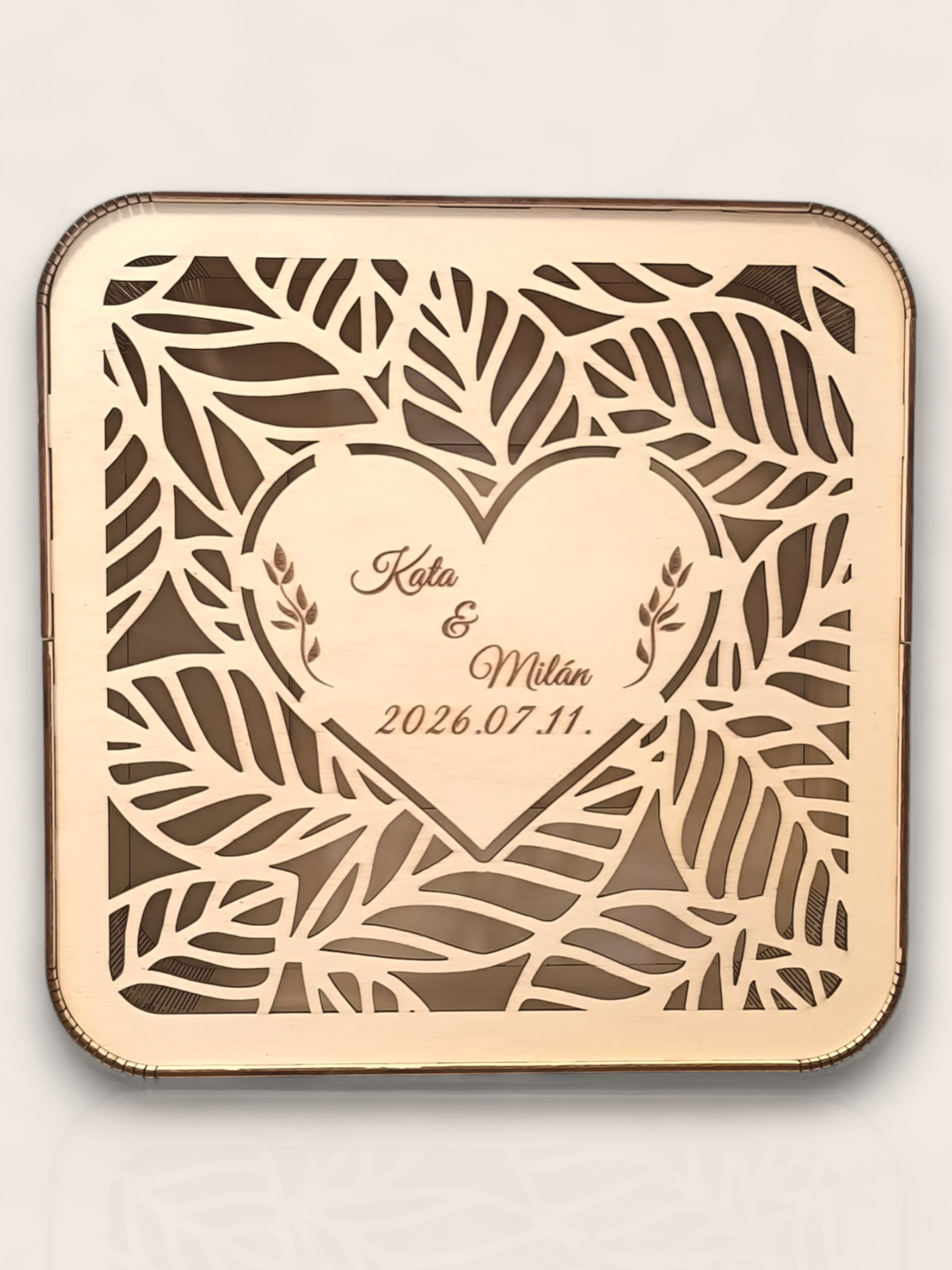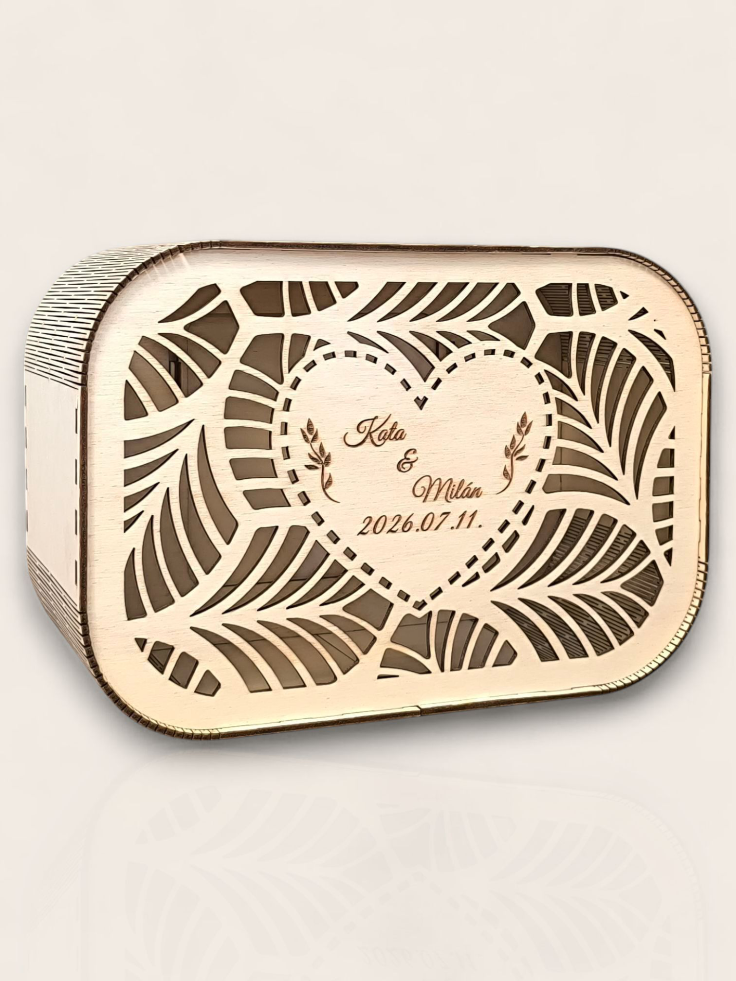 Ez a nagyméretű, gravírozott pénzgyűjtő doboz tökéletes az esküvői ajándékasztalra. A vendégek egyszerűen bedobhatják a pénzt, utalványt vagy kártyát tartalmazó borítékokat – diszkréten és rendezetten. A doboz 3 mm vastag nyír rétegelt lemezből készül, a tetején lévő nyíláson keresztül dobhatók be a borítékok. Az elején lézergravírozással szerepel a házaspár neve és az esküvő dátuma – kérésre akár egyedi szöveggel, idézettel is. Hátul nyitható.