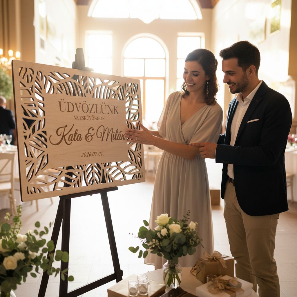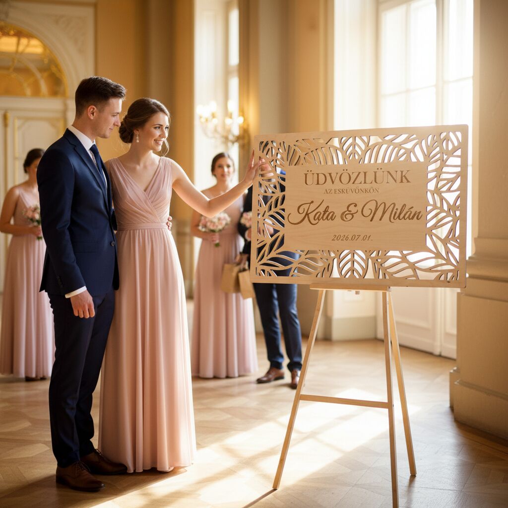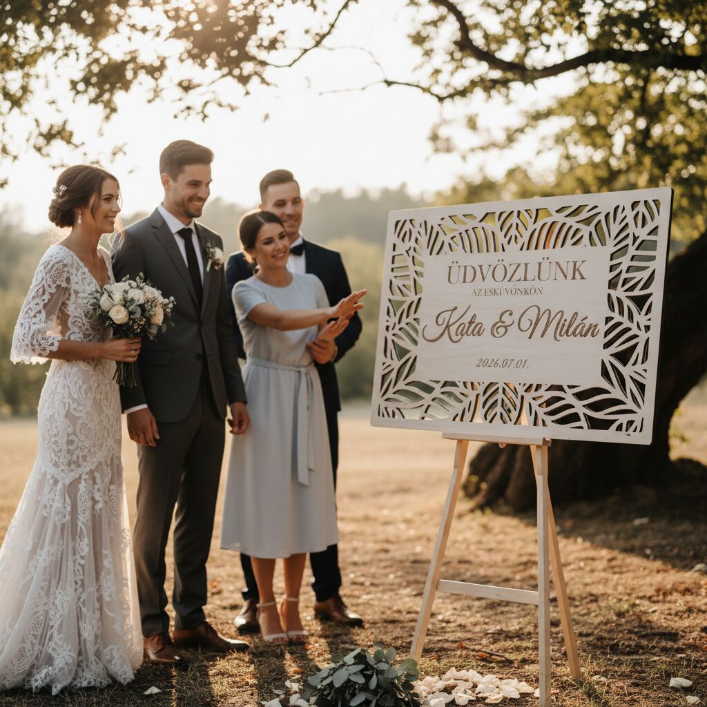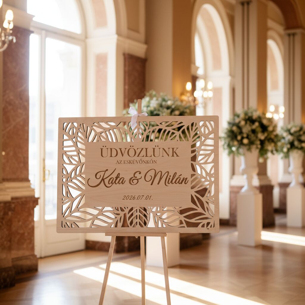 Ez a gyönyörű üdvözlő tábla tökéletes kiegészítője minden stílusú esküvőnek. A házaspár keresztneve, az „Üdvözlünk az esküvőnkön” felirat és a dátum lézergravírozással kerül a táblára – így minden darab teljesen személyre szabott.