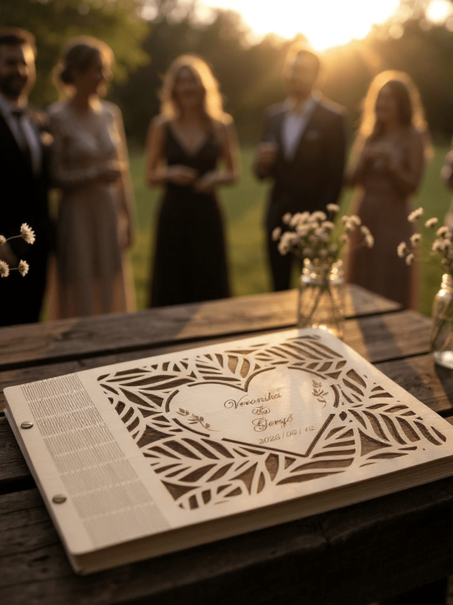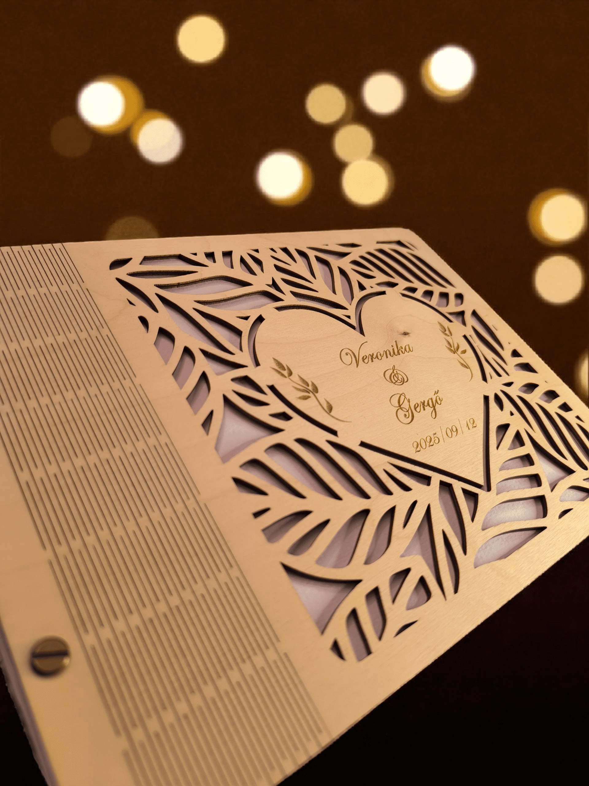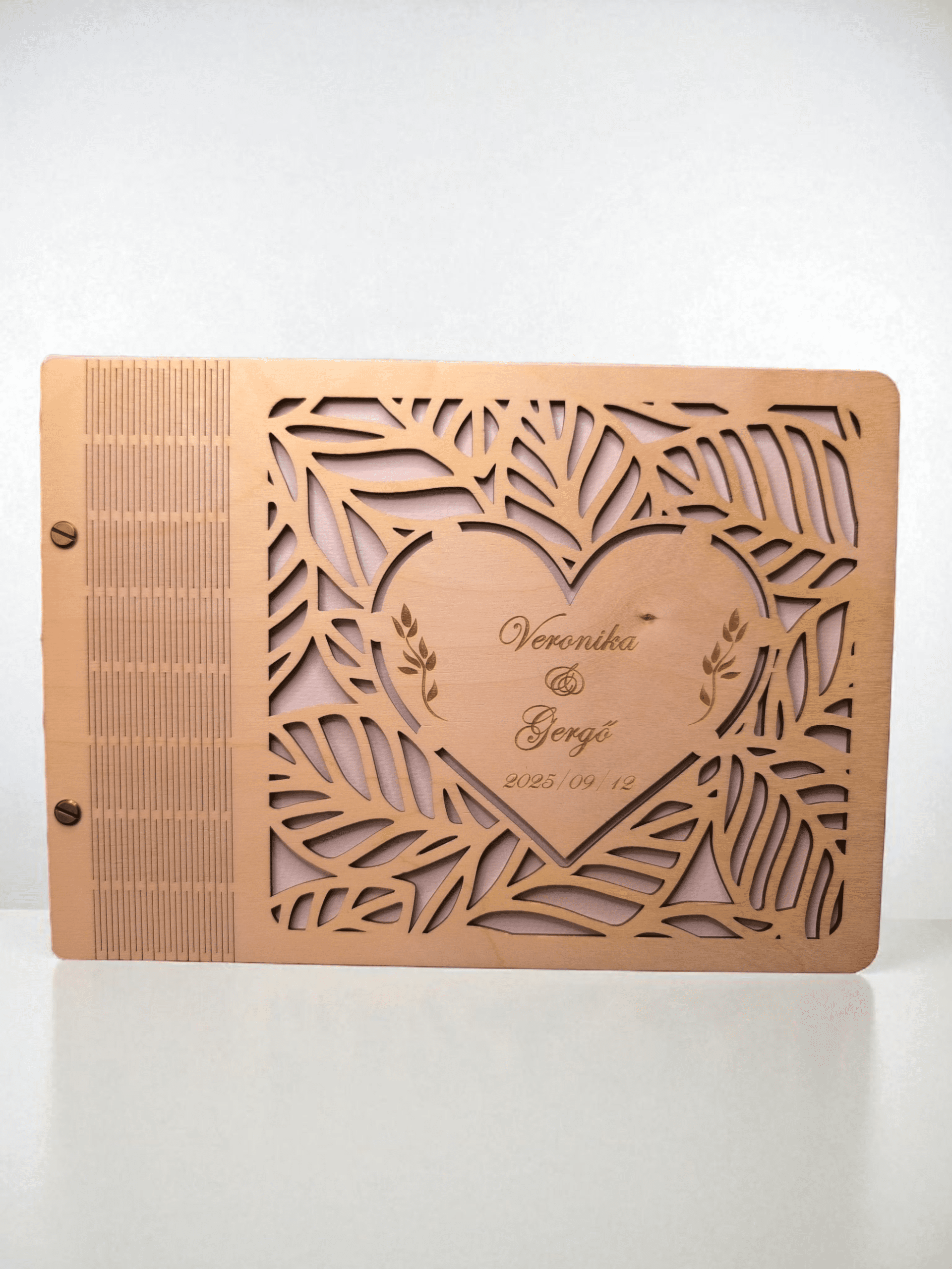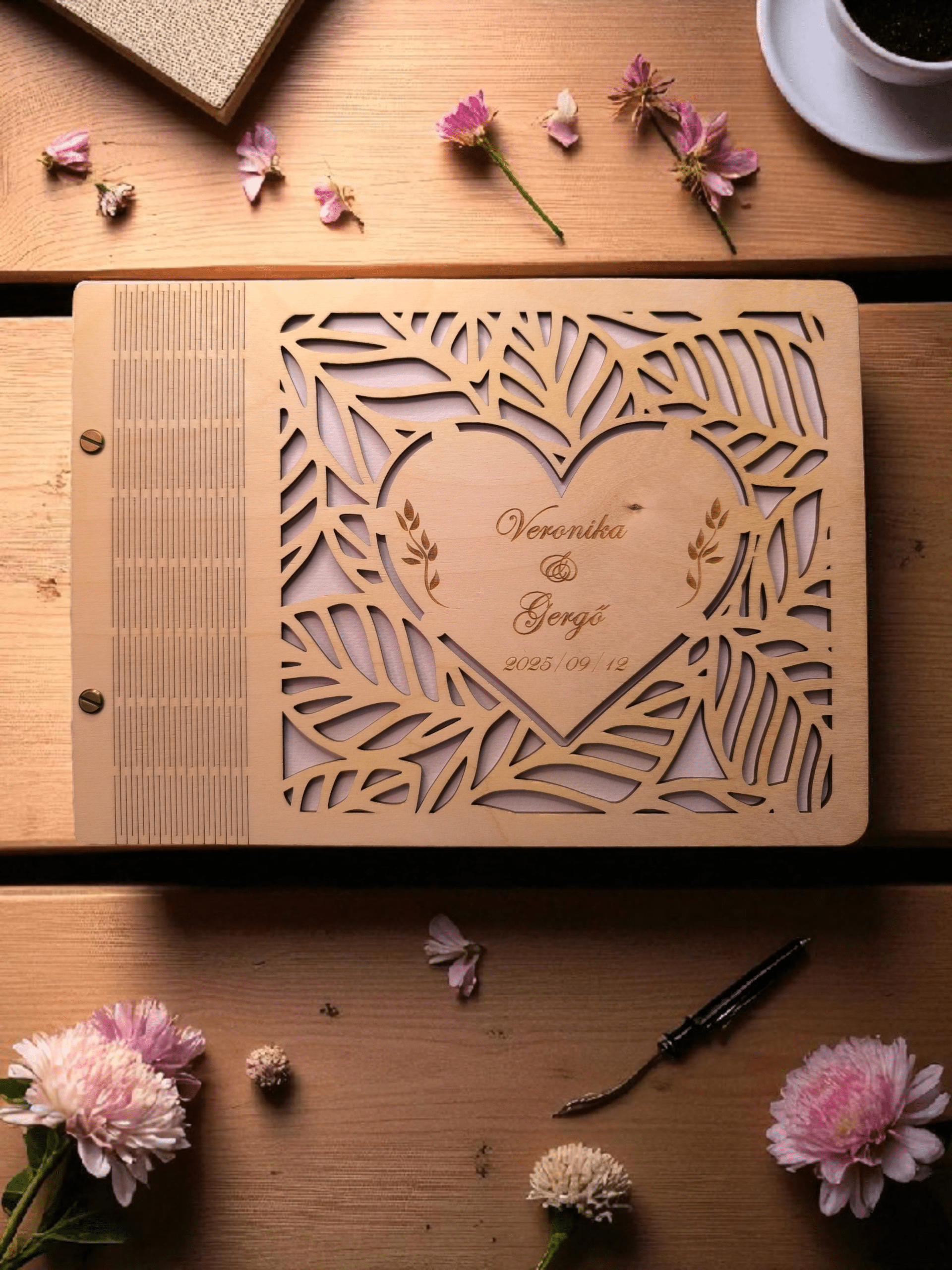 Ez a stílusos, gravírozott fa borítós fotóalbum tökéletes választás az esküvői képek méltó megőrzésére. A borítóra kerül a házaspár neve és a nagy nap dátuma, így az album már első ránézésre is személyes, szívhez szóló darab.