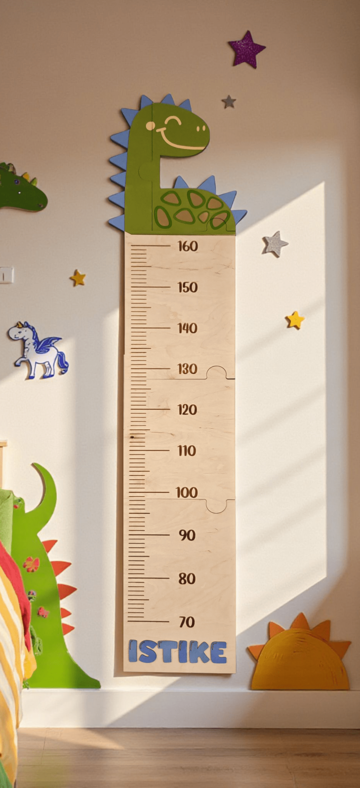 A magasságmérő tetejét választható, festett unikornis vagy dínó figura díszíti, így minden darab egyedi, színes és játékos kiegészítője lesz a gyerekszobának.