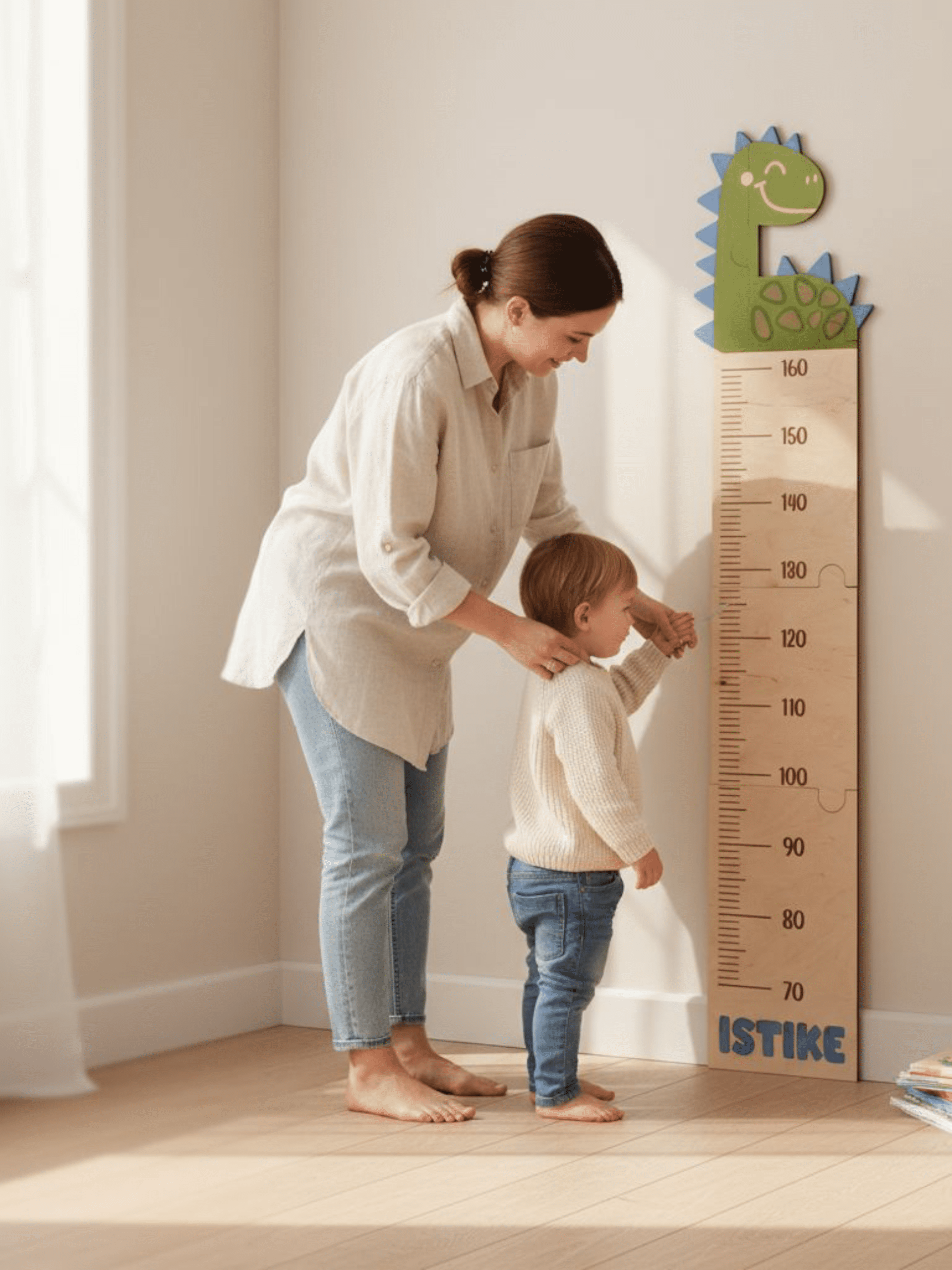 Ez a magasságmérő nemcsak praktikus kiegészítő, hanem egy kedves emlék is, amely évek múltán is mosolyt csal majd az arcokra. Természetes, meleg fa felületével harmonikusan illeszkedik bármilyen gyerekszoba hangulatába, és örömmel kíséri végig a kicsi növekedését.