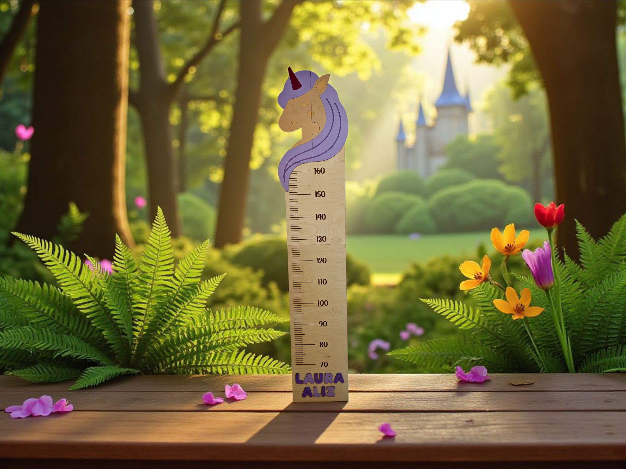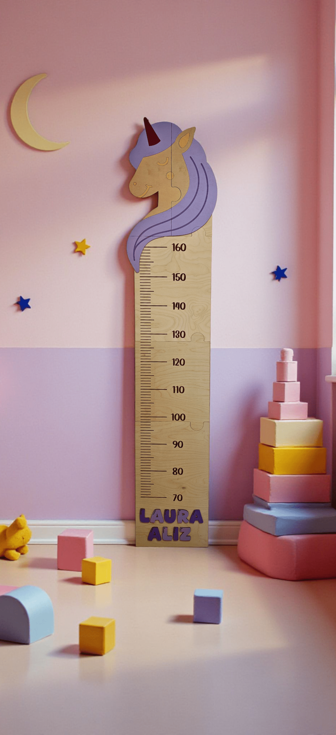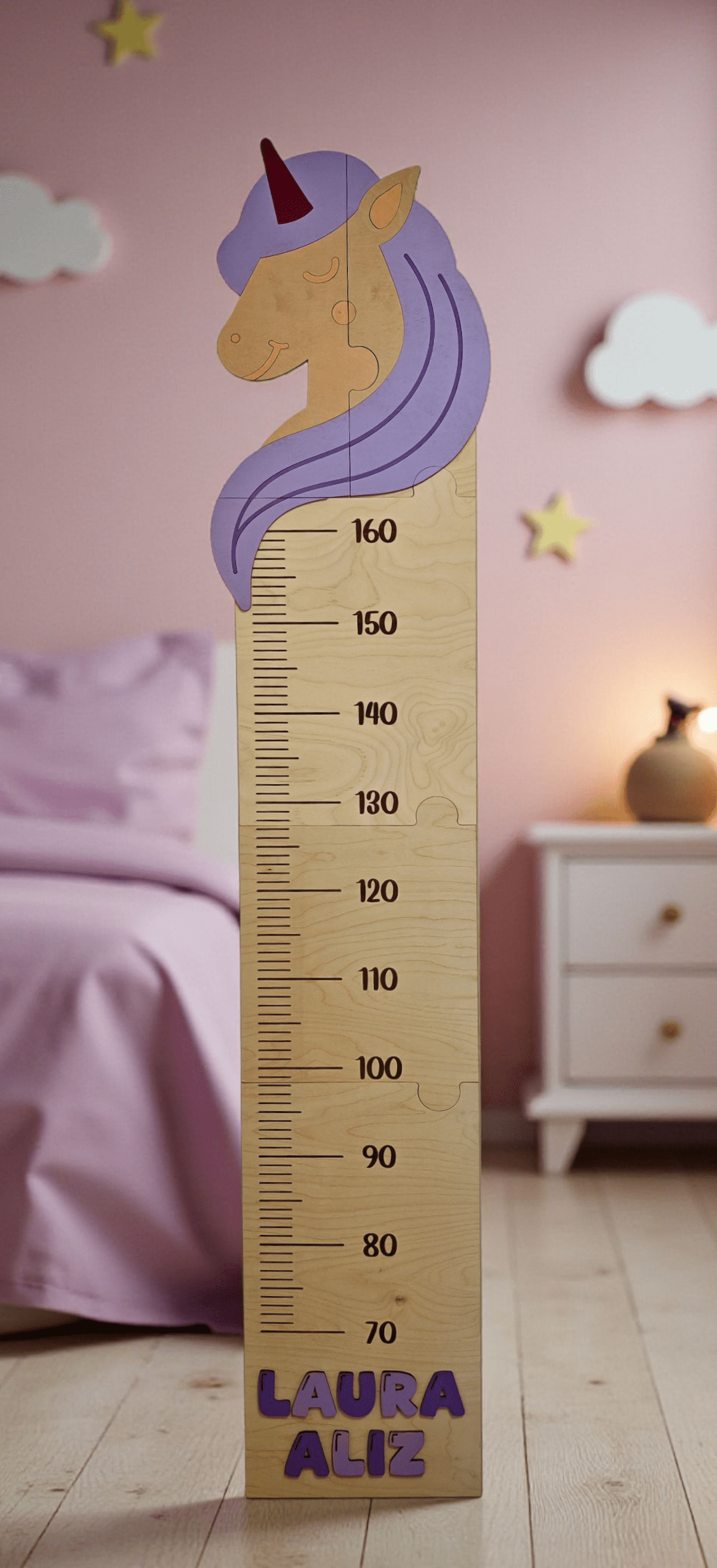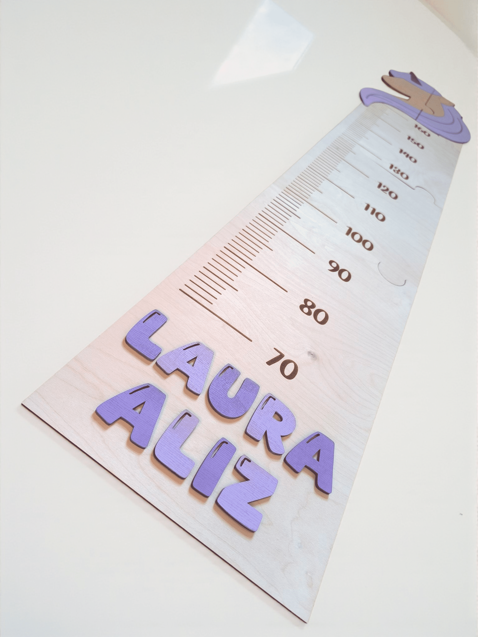 - Díszítés: festett unikornis vagy dínó minta a magasságmérő tetején, lent pedig a gyermek neve