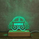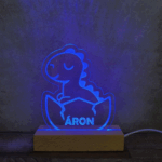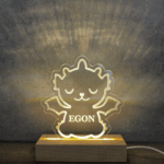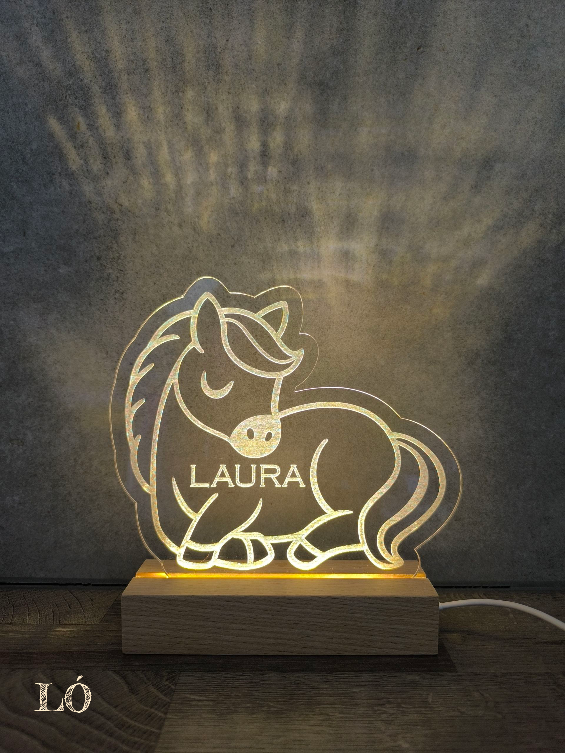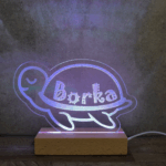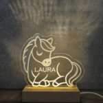 A lámpa áttetsző plexilapjára a gyermek neve kerül, kedves figurákkal díszítve – választhatsz rakétát, lovat, szivárványt, dínót, pillangót, macit, rókát, autót, cicát, teknőst vagy sárkányt. Minden minta saját hangulatot hoz a szobába, és különleges ajándék lehet bármilyen alkalomra.