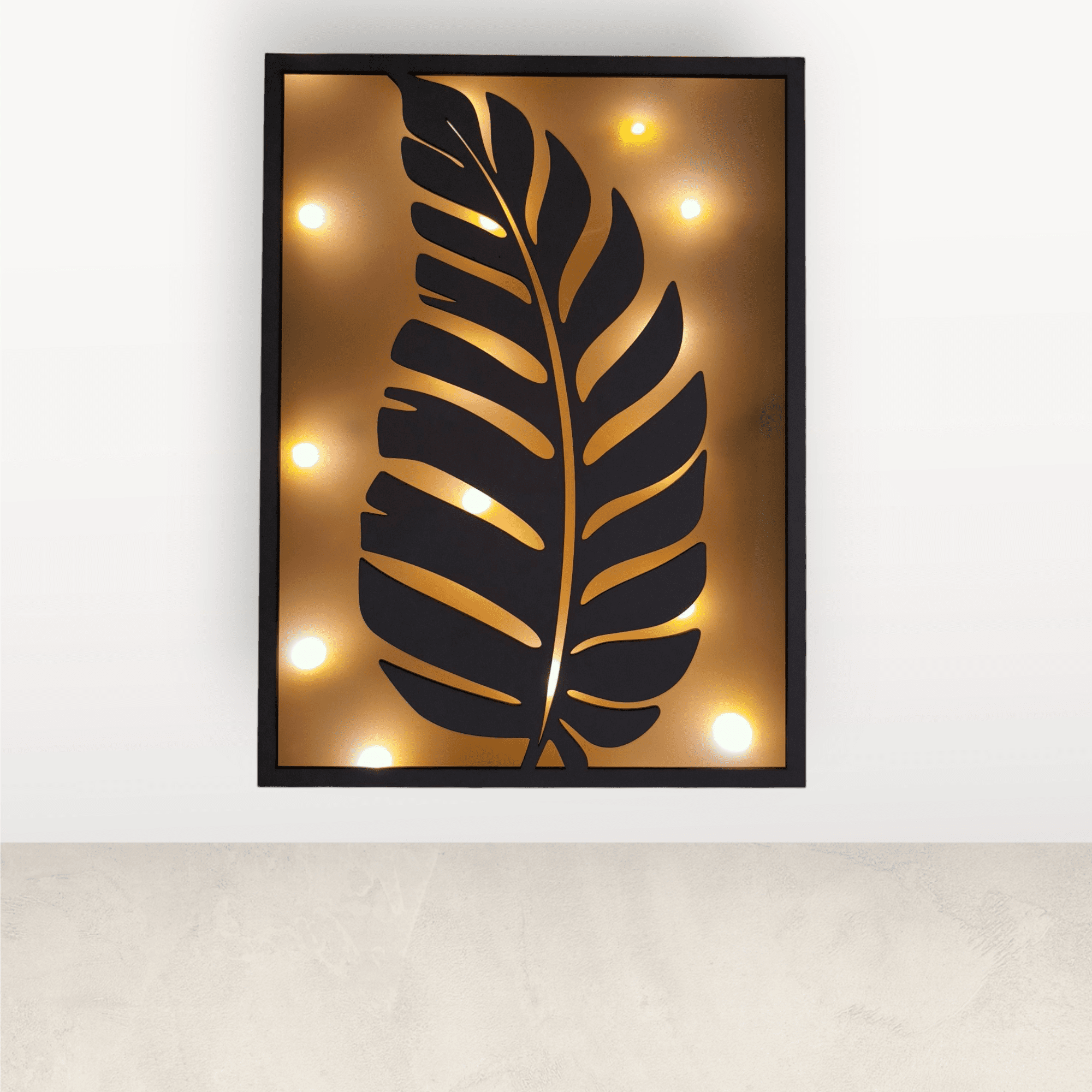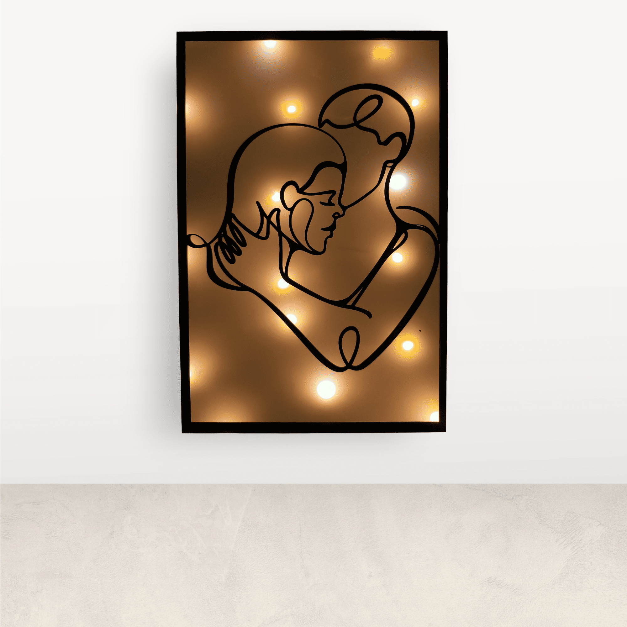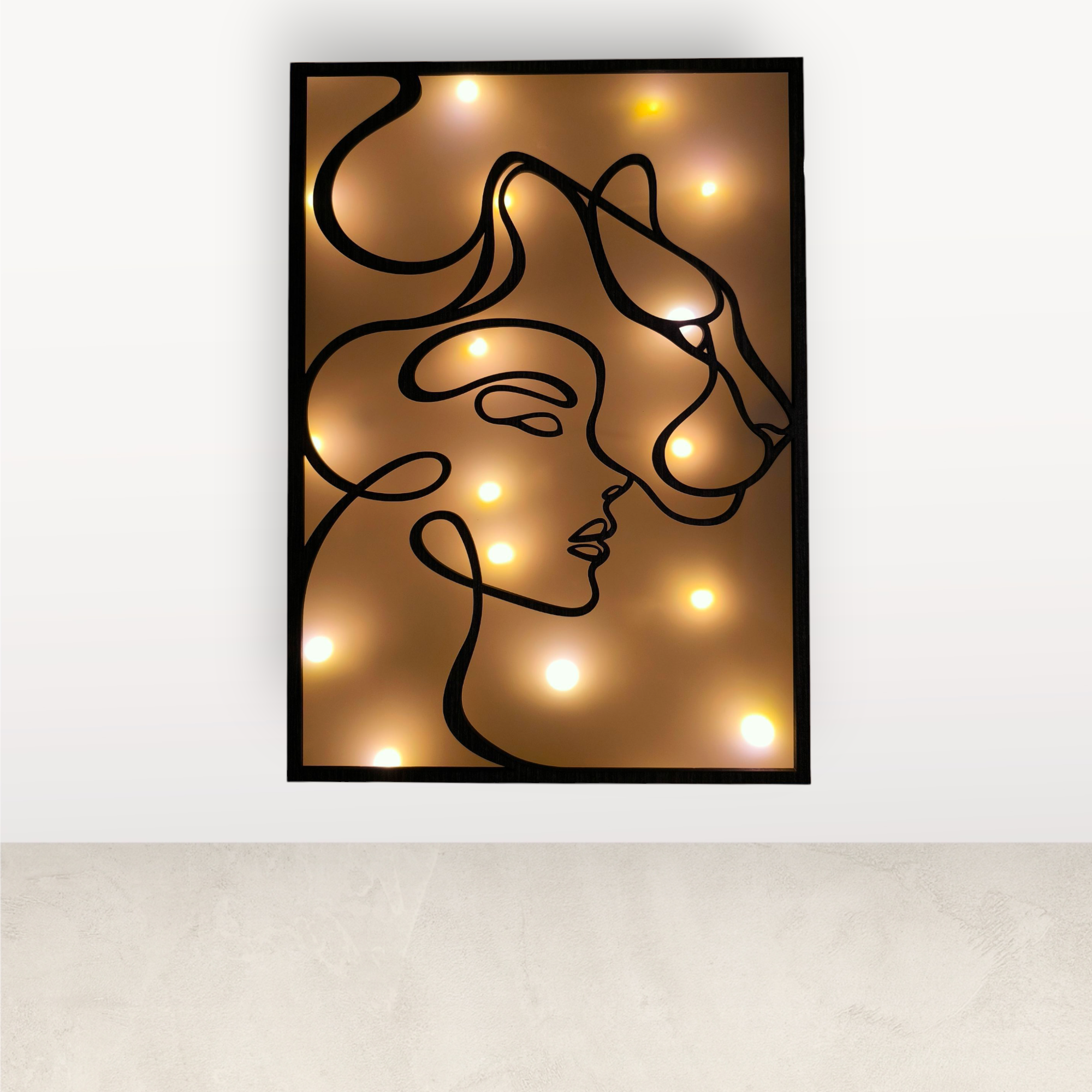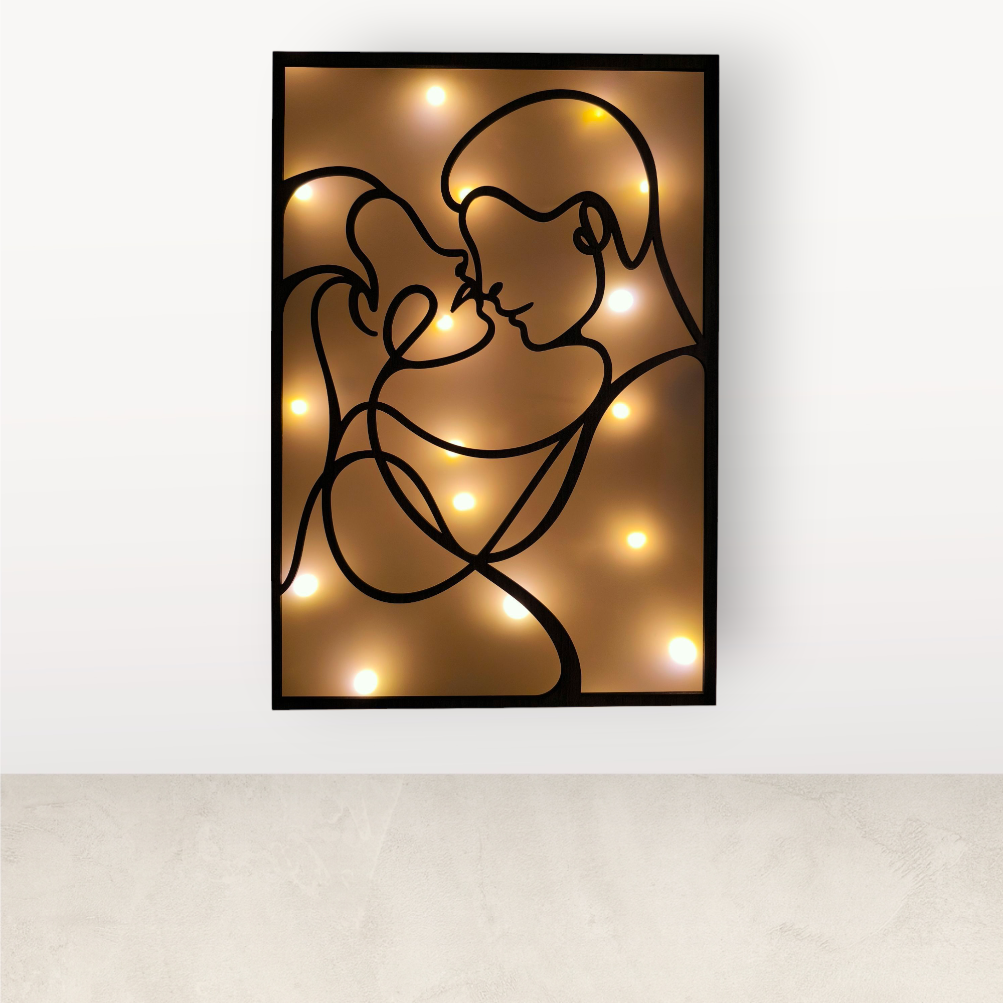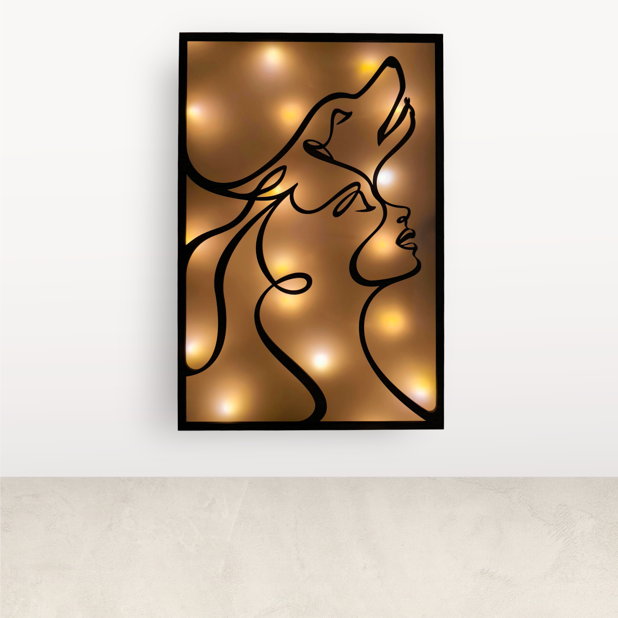 A falikép nem LED szalagos, hanem elemes égősorral működik, így a fény nem egyenletes vonalban, hanem lágy, apró fényforrásokból áll össze, ami intimebb hatást kelt – különösen esti, félhomályos környezetben.
