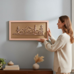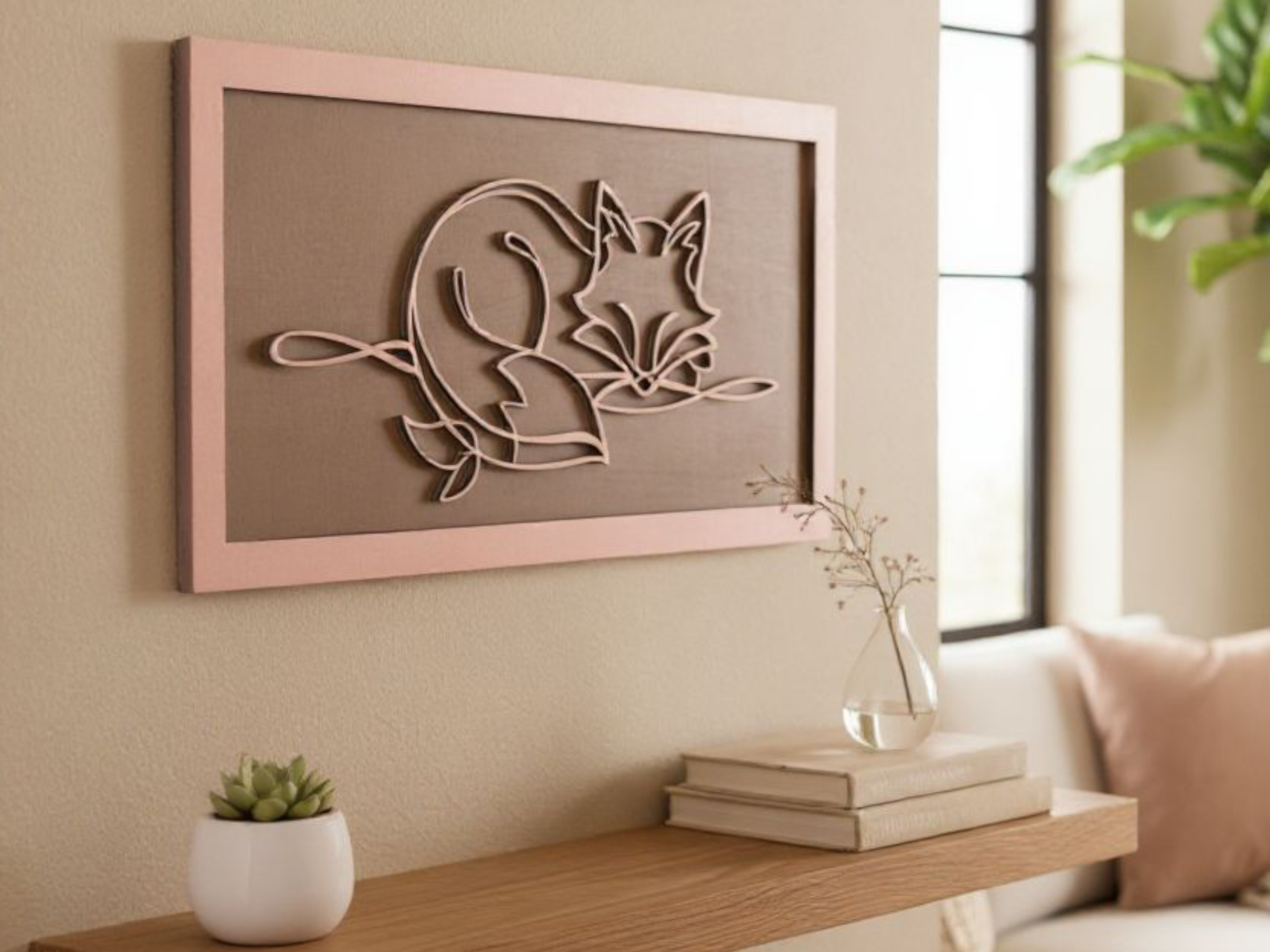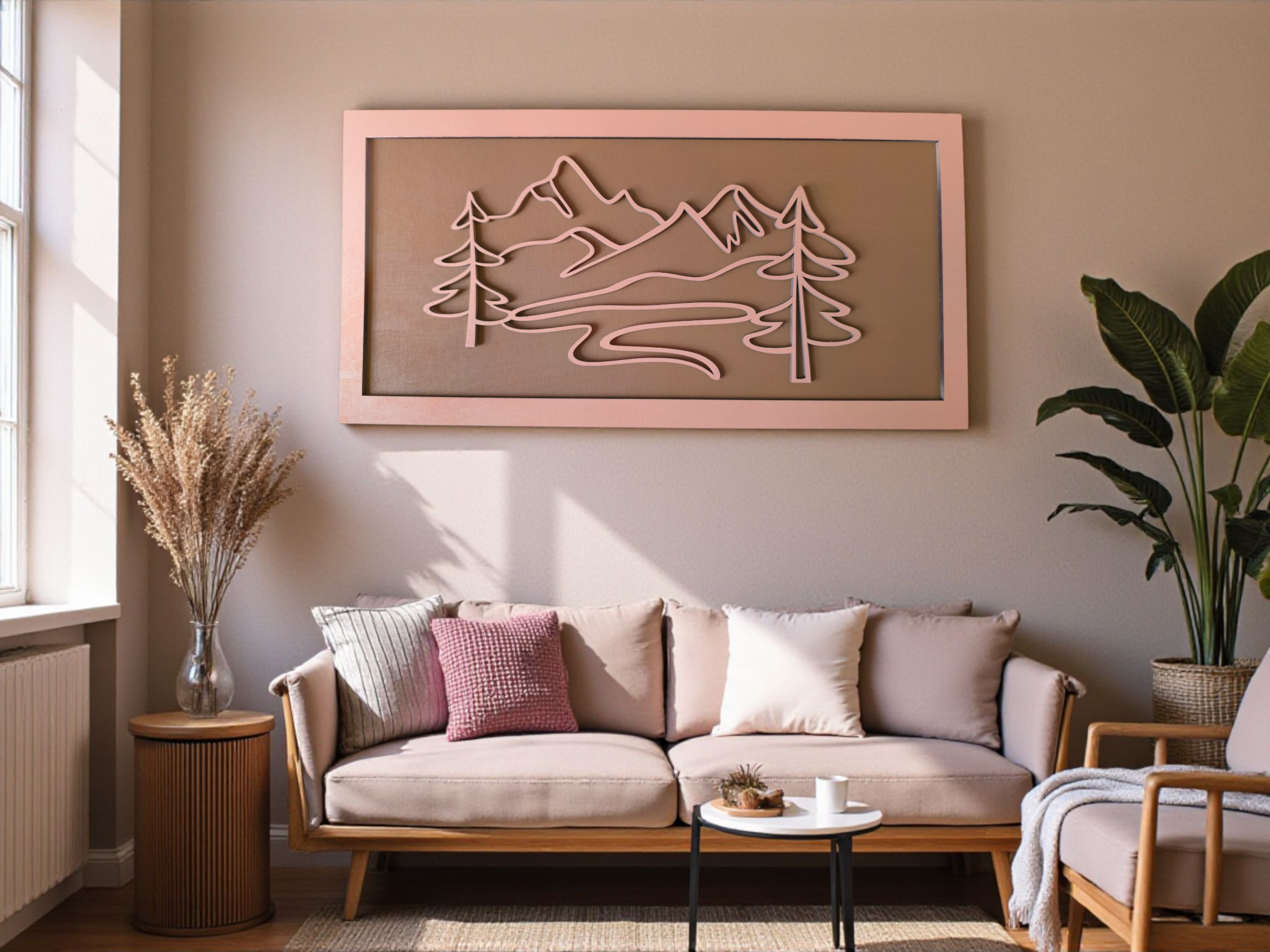 A természetes fa keret és az egyszínű háttér kombinációja modern, mégis otthonos megjelenést biztosít.
